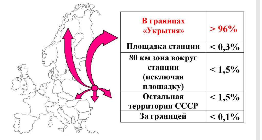 - Часть графитовой кладки, разрушенных кассет с ядерным топливом и обломков металлоконструкций через образовавшийся пролом выброшена в Центральный зал и, далее, через уже не существующую крышу, на площадку станции. А радиоактивная пыль выброшена далеко за пределы этой площадки.